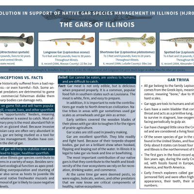 In 2016 I was involved in the writing and promotion of a pro-gar resolution that passed unanimously in both the Illinois House and Senate. As part of the lobbying process, I wrote and designed a pair of information sheets that we could give senators and representatives who were unfamiliar with the fish in general and the issues in particular. Famed fish artist Joe Tomelleri generously allowed me to use his gar images. A blog post I wrote on the subject: http://moxostoma.com/illinois-gar-management-resolution/